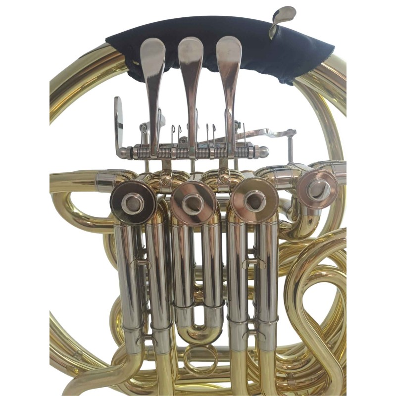 Permite ejecutar repertorios amplios en tonalidades Si♭ y Fa, ideal para músicos avanzados y profesionales. Con un acabado lacado dorado, que ofrece brillo, protección anticorrosión y resistencia al uso. Sistema de válvulas: cuatro cilindros (rotor valves), mecánica precisa que facilita cambios suaves de afinación.